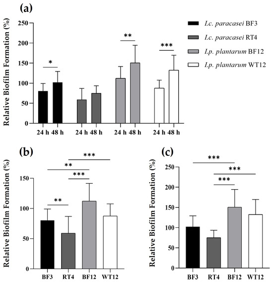 Time-dependent comparison of relative biofilm formation by Lc. paracasei BF3, Lc. paracasei RT4, Lp. plantarum BF12, and Lp. plantarum WT12, at 24 and 48 h (a). Relative biofilm formation comparison between LAB strains at 24 h (b), and 48 h (c). Results are expressed as percentages relative to those of the reference strain (S. aureus ATCC® 25923). The asterisks indicate levels significantly different between bacterial treatments (* p ≤ 0.05, ** p ≤ 0.01, and *** p ≤ 0.001).