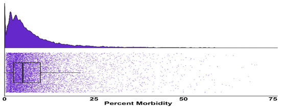 Records for 16,809 cohorts were originally acquired from collaborators. The application of the exclusion criteria outlined above resulted in 12,785 cohorts of feedlot cattle in the dataset. The final dataset of 12,785 cohorts encompassed 4038 cohorts of heifers and 8747 cohorts of steers. These cohorts included 2,206,338 head of cattle that originated from 38 states across the United States; 631,521 head were heifers and 1,574,817 head were steers. The analysis of the included cohorts found the median percent morbidity risk was 5.1% with an interquartile range of 2.5% to 10% (Figure 1).