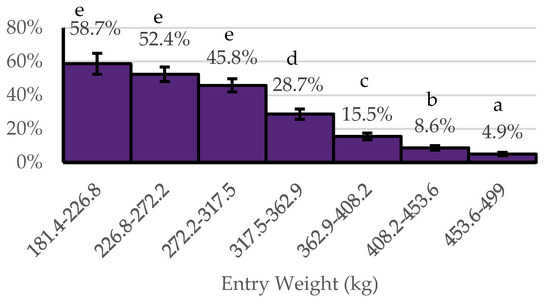 Probability of benefiting economically from metaphylaxis (YESMET) by entry weight. abcde Bars without a common superscript letter differ at p ≤ 0.05.