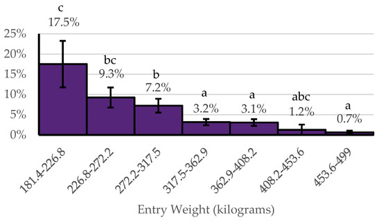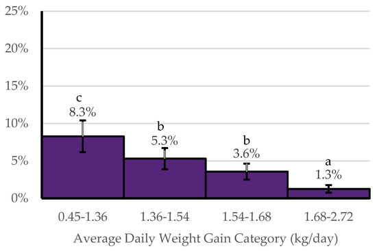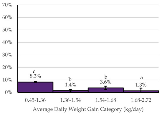 When comparing NOMET to YESMET, sex, the entry weight category, number of cattle in the cohort, and the average daily weight gain category were found to be statistically significant. Cohorts of steers had a higher probability (31.2 ± 3.3%) of benefiting economically from metaphylaxis in comparison to cohorts of heifers (19.9 ± 2.5%) (p < 0.05). Cohorts within the three lowest average entry weight intervals (37 kg intervals) had a higher probability of benefiting economically from metaphylaxis than the other four weight categories (Figure 2). Cohorts of less than 100 head of cattle had a higher probability (30.0 ± 3.3%) of benefiting economically from metaphylaxis in comparison to cohorts with 100 to 200 head of cattle (25.1 ± 2.9%) (p < 0.05) and those cohorts with over 200 head of cattle (20.8 ± 2.6%) (p < 0.05). Cohorts with an ADG of 0.45–1.36 kg/day had a higher probability (8.3 ± 0.5%) of benefiting economically from metaphylaxis compared to those with ADG greater than 1.36 kg/day (Figure 3).
