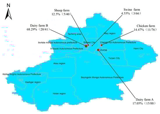 Two large-scale dairy farms (Farm A and Farm B) were selected, about 180 km apart. Farm A is located in Urumqi, Xinjiang, China, with 1000 Holstein cows, while Farm B is located in the Tacheng region of Xinjiang, China, with 800 Holstein cows. Both farms share the same management style, with cows fed a total mixed ration (TMR), cows milked three times a day, and sawdust used for bedding. The sheep farm is located in Shihezi City, Xinjiang, China, with 500 heads of Kazakh sheep, one of the local sheep breeds in Xinjiang. Captive breeding was used and barley and soybean meal were fed. The chicken farm is located in Changji, Xinjiang, China. The farm currently has 10 chicken sheds with about 6000 Hyland Brown Shell egg-laying hens in each building and adopts a three-dimensional farming model with automatic lamp-controlled lighting and an automatic water supply system. The swine farm, also located in Changji, Xinjiang, China, but about 170 km away from the chicken farm, has 1400 New American Duroc pigs. Swine farms are intensively managed.