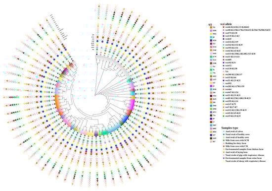 - Xu, T.; Wu, X.; Cao, H.; Pei, T.; Zhou, Y.; Yang, Y.; Yang, Z. The Characteristics of Multilocus Sequence Typing, Virulence Genes and Drug Resistance of Klebsiella pneumoniae Isolated from Cattle in Northern Jiangsu, China. Animals 2022, 12, 2627. [Google Scholar] [CrossRef]