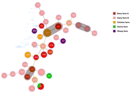 A minimum spanning tree was constructed for 49 strains of K. pneumoniae except for 13 untyped strains (see Figure 3). The tree revealed three clonal complexes (CC) out of 35 ST types: ST161 and ST5387, ST3071 and ST1337, ST290 and ST1066. STs in the latter two CCs were exclusively from the same dairy farm. Whereas, ST161 from the first clonal complex was obtained from K. pneumoniae in dairy farm bedding in Urumqi, ST5387 was obtained from anal swab samples of healthy laying hens and environmental fecal samples from the chicken farms. In addition, ST42 was detected in samples from both the swine and dairy farms. This all indicates the homology of K. pneumoniae from different animal sources. Meanwhile, isolates from the sheep farms could be found to be genetically distant from isolates from other farms, and K. pneumoniae of dairy origin had rich genomic diversity.