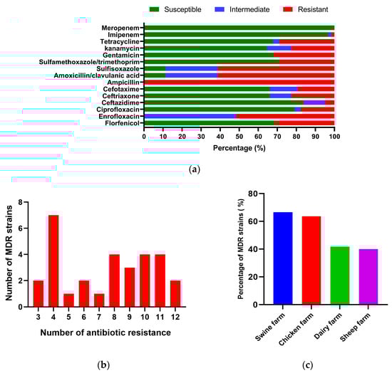Antibiotic susceptibility testing was performed on Mueller–Hinton agar (MHA) using the Kirby–Bauer disk diffusion method [30]. A total of 15 antibiotics were tested, including ampicillin (AMP, 10 μg), florfenicol (FFC, 30 μg), enrofloxacin (ENR, 5 μg), ciprofloxacin (CIP, 5 μg), gentamicin (CN, 10 μg), kanamycin (KAN, 30 μg), meropenem (MEM, 10 μg), imipenem (IPM, 10 μg), tetracycline (TCY, 30 μg), sulfisoxazole (SF, 300 μg), cotrimoxazole (SXT, 1.25/23.75 μg), ceftazidime (CAZ, 30 μg), cefotaxime (CTX, 30 μg), ceftriaxone (CRO, 30 μg), and amoxicillin/clavulanic acid (AMC, 20/10 μg). The antimicrobial disks were obtained from Microbial Reagent (Hangzhou Microbial Reagent Co., Hangzhou, China). The quality control strains were K. pneumoniae ATCC 700603 and Escherichia coli ATCC 25922. Interpretation of the diameters of the zone of inhibition was based on the recommendations of the Institute of Clinical and Laboratory Standards [31]. Isolates were categorized as MDR if they were resistant to ≥3 different antibiotic classes [32].