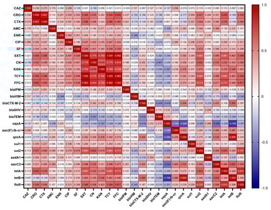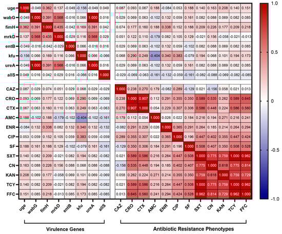 Correlation between virulence genes and antibiotic resistance phenotypes. The intensity of the color indicates the numerical value of the correlation coefficient (r).