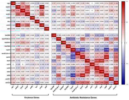 Correlation between virulence genes and antibiotic resistance genes. The intensity of the color indicates the numerical value of the correlation coefficient (r).