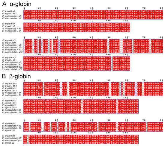 Alignment of amino acid sequences for the adult-expressed α- (A) and β-type globin genes (B) from high- and low-altitude E. argus and E. multiocellata performed on the ESPript 3.0 online tool.