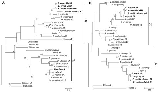 It has been revealed that the αE-, αD-, and αA-globin genes diverged through duplication events before the radiation of tetrapods [29,32,33]. Thus, the homologous sequences from human (Homo sapiens) and chicken (Gallus gallus) were included for alignment of amino acid sequences and reconstruction of the phylogenetic relationships of α and β globin of Eremias lizard. The amino acid sequences of α- and β-type globins were aligned using muscle implementation in MEGA 11. Subsequently, the maximum likelihood phylogenies for α-type and β-type were estimated using LG + G + I and LG + G models of amino acid substitution with five different site categories, respectively. The support rate of branch nodes was evaluated by 1000 bootstrap pseudoreplicates.