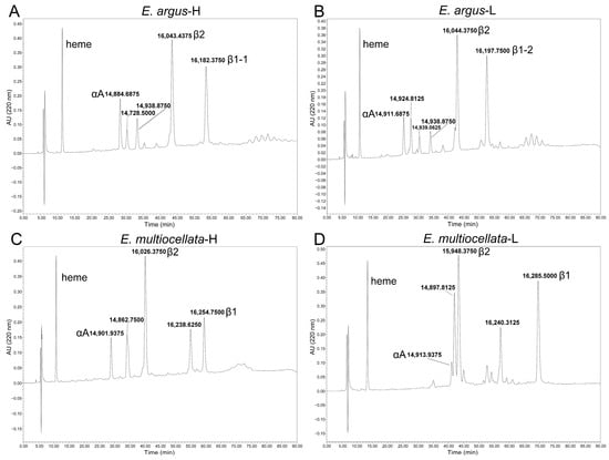 αA globins were the first to be eluted, β1 globins were the last to be eluted in all studied populations, and β2 globins were the penultimate globins eluted in two populations of E. argus, while the antepenultimate globins were eluted in two populations of E. multiocellata (Figure 3). The ratio of β2/β1 globin was the highest in high-altitude E. multiocellata (~2.25), the same in two populations of E. argus (~1.38), and the lowest in low-altitude E. multiocellata (~1.23) based on the analysis of the HPLC peak using ImageJ 1.54g software. However, there are additional peaks whose MWs did not match our sequenced globins. Two peaks with MW values of 14,728.5000 Da and 14,938.8750 Da, and three peaks with MW values of 14,924.8425 Da, 14,939.0625 Da, and 14,938.8750 Da, were identified in high-altitude and low-altitude E. argus, respectively. Two distinct peaks, with similar interpopulation elution times and MW values, were identified in high-altitude (MW = 14,862.7500 Da, 16,238.6250 Da) and low-altitude (MW = 14,897.8125 Da, 16,240.3125 Da) E. multiocellata.