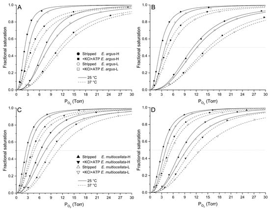 O2 equilibrium curves of high- and low-altitude E. argus Hbs ((A): pH7.8, (B): pH7.4) and high- and low-altitude E. multiocellata Hbs ((C): pH7.8, (D): pH7.4) at 25 °C (continued lines) and 37 °C (dotted lines) in the absence (stripped) and presence of Cl− (added as 0.1 mol/L of KCl) and ATP (100-fold molar excess over tetrameric Hbs). In E. argus, the stripped status and presence of Cl− and ATP were denoted by circles and squares, respectively. In E. multiocellata, the stripped status and presence of Cl− and ATP were indicated by triangles and upside-down triangles. The high- and low-altitude populations are represented by solid and open symbols, respectively. n = 6 lizards for each population, and 6 technical repeats were performed for each experimental condition.