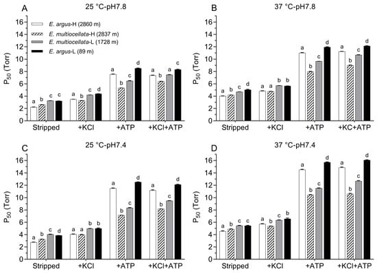 P50 values (mean ± SE) of Hbs from high- and low-altitude populations of E. argus and E. multiocellata measured at 25 °C pH7.8 (A), 37 °C pH7.8 (B), 25 °C pH7.4 (C), and 37 °C pH7.4 (D) in the absence (stripped) and presence of Cl− (added as 0.1 mol l− of KCl) and/or ATP (100-fold molar excess over tetrameric Hbs). Different letters above the P50 values of the four populations indicate significant differences between each pair of populations under the same allosteric condition according to one-way ANOVA using the LSD method of post hoc multiple comparisons (p < 0.05). n = 6 lizards for each population, and 6 technical repeats were performed for each experimental condition.