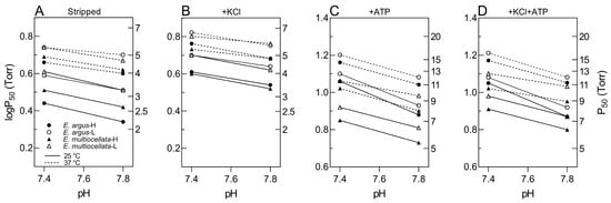 Bohr plots (logP50 vs. pH) of high- and low-altitude E. argus and E. multiocellata in the absence ((A): stripped) and presence of KCl (B), ATP (C), and +KCl+ATP (D) at 25 °C (continuous lines) and 37 °C (dotted lines). E. argus and E. multiocellata were denoted by circles and triangles, respectively. The high- and low-altitude populations are represented by solid and open symbols, respectively. The slope of these linear plots is equal to the corresponding Bohr factor (Φ, Table 2), which was used to indicate the magnitude of the Bohr effect. n = 6 lizards for each population and 6 technical repeats were performed for each experimental condition.