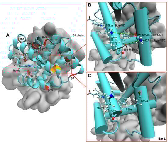 Spatial locations of heme, distal 63 His, and proximal 92 His on the β subunit of Hb models (A). The distal 63 His and proximal 92 His (represented by ball-and-stick) and the seven different amino acid residues in the β2 globin of the low-altitude E. argus compared with those of the other three Eremias lizards were marked in red, and the 75Ile and 76Lys were marked in yellow in (A). Hydrogen bonds (indicated by the green dotted line) formed between 12β2 and 75Ile and/or 76Lys (represented by ball-and-stick) on the adjacent E-helix in all Hb models composed of β2 globin with all α globins in high-altitude E. argus and high- and low-altitude E. multiocellata Hbs (B). However, these two hydrogen bonds were lost in the Hbs of low-altitude E. argus (Ear-L) due to the replacement of Asn with Ala at β12 (C). The β1 chain is represented by cyan, and the β2 and two α chains are represented by silver in the QuickSurf drawing method of VMD.