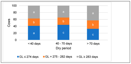 Distribution of cows based on gestation period (GL), categorized by dry period. Statistical significance exists between dry period groups categorized by gestation period, designated with different letters; p < 0.05.
