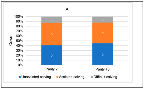 Unassisted calving occurred in cows of parity 2 in 4.2% more cases compared to parity ≥ 3. On the other hand, the incidence of assisted calving was 4.0% higher in cows of parity 2. The occurrence of difficult calving was at a similar level in both groups of cows (Figure 3A).