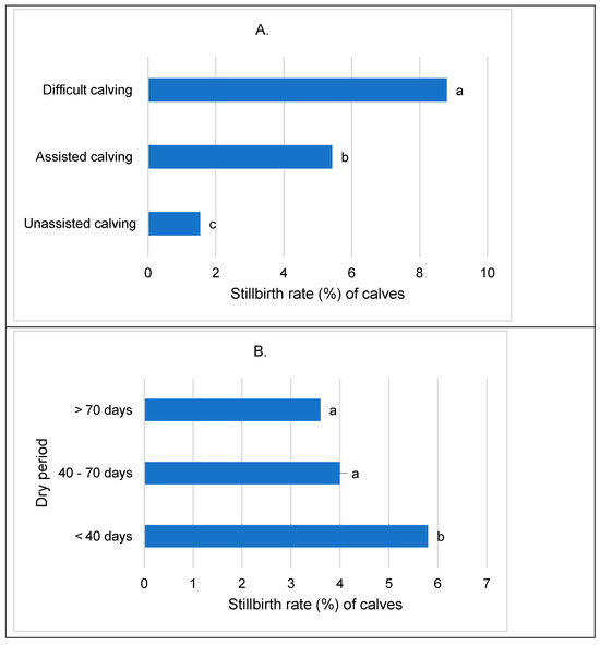 Stillbirth rate (%) of calves based on calving assessment of cows (A), dry period length (B) and gestation period (C). Statistical significance exists between groups designated with different letters; p < 0.05.