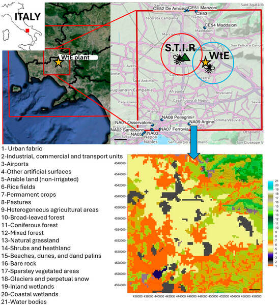 Map of the area of interest. The location is indicated as a red square on the small-size map of Italy in the top left corner. The monitoring stations in Acerra (coordinates: 40.94411, 14.37144) and Caivano (coordinates: 40.98981, 14.30229) are situated in the Campania region in the vicinity of the waste-to-energy plant (indicated by the yellow star), and the S.T.I.R (green triangle), respectively. The bee icons indicate the apiaries, and the foraging radii of the honeybees are indicated by the red and blue circles, which correspond to 3 km. Below that is the representation of the intended use of the territory under study (horizontal resolution: 250 m), with land use codes (21-class classification) reported on the left. Scale bars: 2000 m (2 km). Abbreviations: WtE: waste-to-energy plant; S.T.I.R.: Waste Shredding, Sifting, and Packaging Plant.