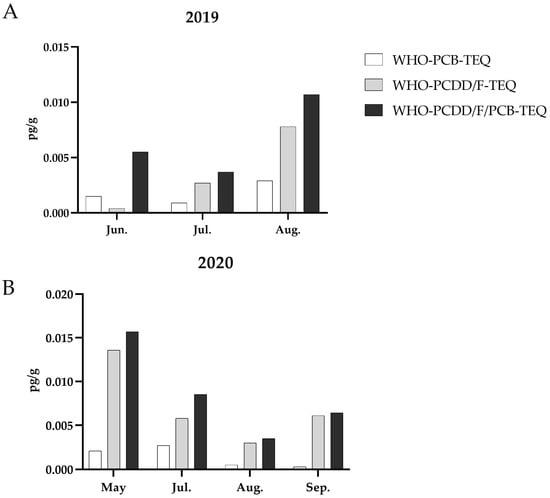 The sum of PCBs (WHO-PCB-TEQ) consistently remained below 0.005 pg/g throughout the two years but exhibited two different patterns over time. In 2019, there was a slight increase from June to August, whereas in 2020, the detected levels decreased towards September. Concentrations of PCDD/Fs (WHO-PCDD/F-TEQ) remained below 0.015 pg/g in 2019 but increased in August. In contrast, in 2020, their highest presence was found in the May sample. The sum of all considered species (WHO-PCDD/F/PCB) was higher in the August 2019 and in the May 2020 samples.