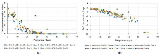 The characteristics of the analyzed cows are shown in Table S1. For all cows in the analysis (p < 0.001), the rates of decrease in PAG concentration, log-transformed PAG, and log-transformed SAA were −0.085/day, −0.062/day, and −0.036/day, respectively (Table 1). By comparing the PAG concentration before (with the link function set to logarithmic) and after (with the link function set to linear) log transformation, we found that estimating the reduction using log-transformed PAG values produced a model with a lower AIC value.