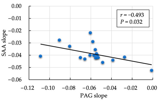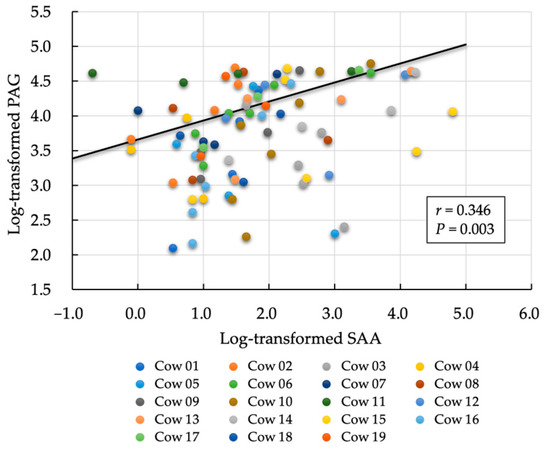 Correlation between the postpartum rate of decrease in pregnancy-associated protein (PAG) and serum amyloid A (SAA) values. Correlation analysis of PAG and SAA within each sample was evaluated using a linear mixed model that included individual cows as the fixed effects. The correlation was calculated by analyzing SAA and PAG using standardized variables with log-transformed values.