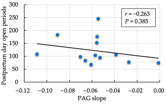We observed a moderately negative correlation between the rate of decrease in SAA and PAG values (r = −0.493, p = 0.032; Figure 2). In contrast, the within-subject correlation between log-transformed SAA and PAG on each measurement day was significantly positive (r = 0.346, p = 0.003; Figure 3). A non-significant but positive correlation was found between the day-one estimate of SAA and PAG slope (r = 0.413, p = 0.079). No significant correlation was observed between the mean SAA value and the rate of PAG decrease during the follow-up period (r = 0.092, p = 0.718). No correlation was observed between the PAG slope and postpartum days open (r = −0.263, p = 0.385; Figure 4).