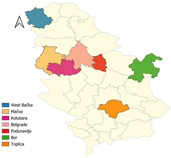 The survey was conducted from November 2022 to June 2023 in seven administrative districts in the Republic of Serbia: Belgrade, Podunavlje, Kolubara, Mačva, West Bačka, Toplica and Bor (Figure 1). Serbia is a landlocked country located in the Balkan peninsula and the Pannonian Plain. Serbia lies between latitudes 41° and 47° N, and longitudes 18° and 23° E. In the northern part of the country, the climate is more continental, with colder winters and warmer summers, while in the southern part, the climate tends to be more Mediterranean, with milder winters and hotter summers. The average annual rainfall ranges from around 600 to 1000 mm. The average elevation of Serbia is approximately 500 m above sea level.