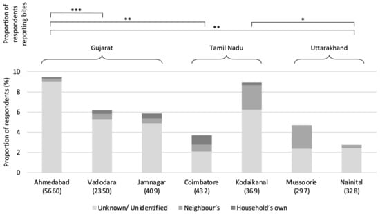 - Sangeetha, S.; Sujatha, K.; William, R.F. An epidemiological study of animal bites among rural population in Tamil Nadu, India. Int. J. Community Med. Public Health 2017, 3, 1413–1418. [Google Scholar] [CrossRef]