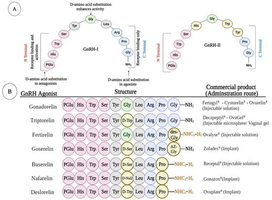 Structural depiction of (A) GnRH isoform (GnRH-I and GnRH-II) and (B) GnRH agonists, including their commercial products and administration route. Created with BioRender.com.