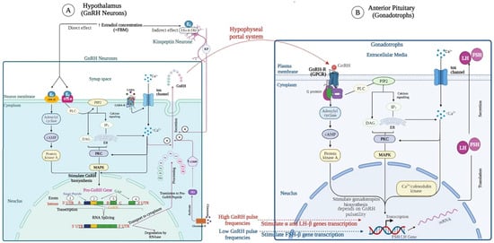 GnRH biosynthesis and secretion regulation involve a complex network of excitatory and inhibitory factors, as illustrated in Figure 2A. This intricate control includes central regulation by distinct subgroups of neurons that connect to GnRH-secreting neurons. Neurotransmitters and neuropeptides, such as Glutamate, Gamma-aminobutyric acid (GABA), Neuropeptide Y (NPY), Leptin, and Gonadotropin-inhibitory hormone (GnIH), have essential functions in this regulatory network. Other intermediates, including protein kinase A (PKA) activators, protein kinase C (PKC), Ca2+, and Phospholipase C (PLC), contribute to the modulation of GnRH release. Furthermore, peripheral gonadal steroid feedback mechanisms have been implicated in the overall regulation of GnRH [22,23,24].
