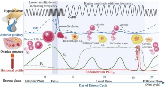 During the first 3–4 days of the luteal phase, known as metestrus, the follicle that underwent ovulation (corpus hemorrhagic) transforms into the CL. This transformation involves the luteinization of the granulosa and theca cells, producing P4 [17,33]. Most ovarian blood flow during this phase goes to the CL to support the P4 production, which is essential for establishing and maintaining pregnancy [16]. Various hormones and signals from the anterior pituitary, uterus, ovary, and embryo regulate P4 concentrations. P4 concentrations remain high during diestrus, and the anterior pituitary releases small concentrations of FSH to stimulate recurrent follicle development. These developing follicles do not undergo ovulation due to insufficient LH pulse frequency [34]. The P4-dominant luteal phase generates higher amplitude but less frequent LH pulses, which is inadequate for follicle ovulation due to negative feedback. As CL regresses, P4 concentrations decrease during proestrus due to the release of uterine prostaglandin (PGF2α) [34,35].