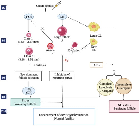 In conjunction with the estrous synchronization of dairy cattle using GnRH and its agonists, illustrated in Figure 4, the administration of a GnRH agonist within a 10-day program has shown positive effects on ovarian follicle dynamics and CL function, enhancing the synchronization of the estrous cycle stage without compromising fertility outcomes [52]. The injection of GnRH agonist on day 0 (the day of GnRH administration) in cows, for which the estrous cycle stage is unknown, induces an increase in circulating FSH and LH. These hormones influence ovarian follicles and CL development [53]. Depending on the developmental stage and as a response to GnRH-induced LH, the largest follicle disappears due to ovulation and the development of a CL or atresia. Consequently, E2 concentration decreases in both cases, preventing recurring estrus in 6 days relative to the treatment time with GnRH [15]. When a CL is present at GnRH administration, the GnRH-induced LH release leads to the development of larger luteal cells (LLC). At the same time, FSH stimulates atresia of small (1.58–3.67 mm) or medium (3.68–8.56 mm) follicles. There is a greater rate of atresia in medium follicles, preventing further development into larger ones.