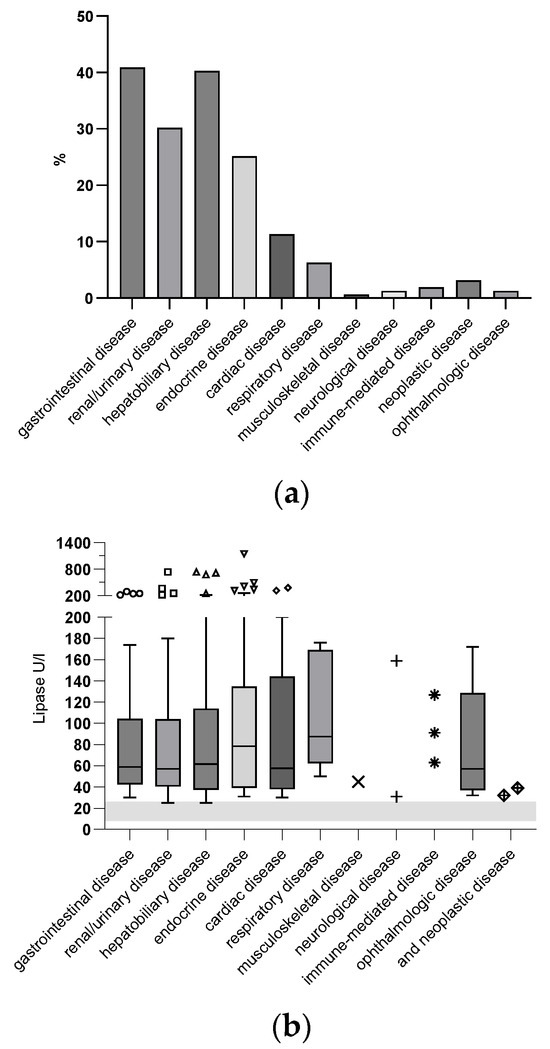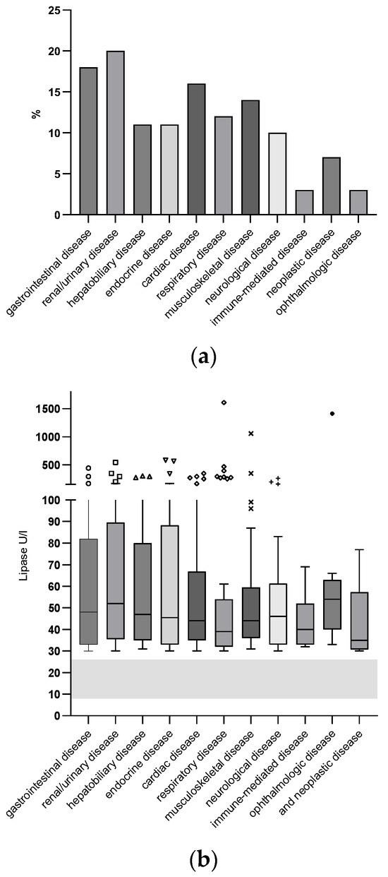(a) Prevalence of comorbidities categorized by organ systems in the PD group. (b) Lipase activities associated with disease categories in the PD group. Box plots span the range from 25th to 75th percentile (IQR), whiskers mark minimum and maximum values excluding outliers which are represented separately as symbols. RI for lipase activity is indicated as a gray-shaded area.