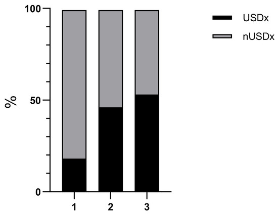 Bar diagram showing frequencies of an ultrasonographic diagnosis of pancreatitis (USDx) among the 3 groups (1 = NP, 2 = PA, 3 = PD). Cats with PA and PD had a USDx significantly more often compared to NP (p < 0.0001). The difference between PA and PD cats was not significant (p = 0.56).