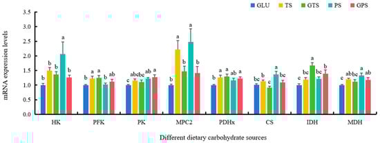 Effect of dietary carbohydrate sources on mRNA expression levels of genes involved in the glycolysis and citric acid cycle in largemouth bass (n = 3). Bars with different superscripts are significantly different (p < 0.05). HK, hexokinase-1; PFK, phosphofructokinase; PK, pyruvate kinase; MPC2, mitochondrial pyruvate carrier 2; PDHx, pyruvate dehydrogenase complex component X; CS, citrate synthase; IDH, isocitrate dehydrogenase; MDH, malate dehydrogenase.
