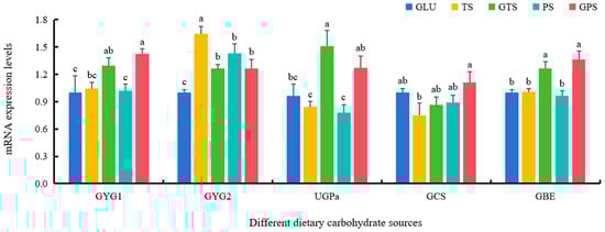 Effect of dietary carbohydrate sources on mRNA expression levels of genes involved in the glycogen synthesis in largemouth bass (n = 3). Bars with different superscripts are significantly different (p < 0.05). GYG1, glycogenin-1; GYG2, glycogenin-2; UGPα, UTP–glucose-1-phosphate uridylyltransferase; GCS, glycogen synthase; GBE, glycogen branching enzyme.