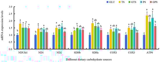 Effect of dietary carbohydrate sources on mRNA expression levels of mitochondrial respiratory electron transport chain genes in largemouth bass (n = 3). Bars with different superscripts are significantly different (p < 0.05). NDUfa1, NADH:ubiquinone oxidoreductase subunit A1; ND1, NADH dehydrogenase subunit 1; ND2, NADH dehydrogenase subunit 2; SDHb, succinate dehydrogenase complex iron sulfur subunit B; SDHc, succinate dehydrogenase complex iron sulfur subunit C; COX1, cytochrome c oxidase I; COX3, cytochrome c oxidase III; ATP6, ATP synthase 6.