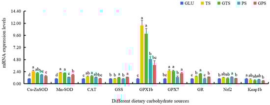 Effect of dietary carbohydrate sources on mRNA expression levels of antioxidant-relative genes in largemouth bass (n = 3). Bars with different superscripts are significantly different (p < 0.05). Cu/Zn-SOD, Cu/Zn-Superoxide dismutase; Mn-SOD, Mn-Superoxide dismutase; CAT, catalase; GSS, glutathione synthase; GR, glutathione reductase; GPX1b, glutathione peroxidase 1b; GPX7, glutathione peroxidase 7; Nrf2, nuclear factor E2-related factor 2; keap1b, Kelch-like ECH associated protein 1b.