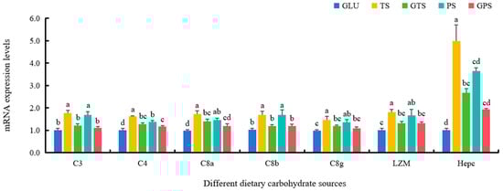 Effect of dietary carbohydrate sources on mRNA expression levels of immune genes in largemouth bass (n = 3). Bars with different superscripts are significantly different (p < 0.05). C3, complement component 3; C4, complement component 4; C8a, complement component 8a; C8b, complement component 8b; C8g, complement component 8g; C9, complement component 9; LZM, lysozyme; Hepc, hepcidin; β-actin, actin beta.