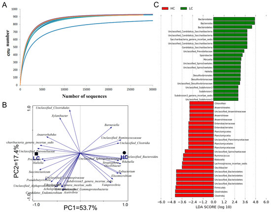 All amplicon libraries were sequenced using an Illumina MiSeq platform (San Diego, CA, USA), and the raw sequences were processed using QIIME. The assembled reads were demultiplexed according to the barcode sequences, and chimeric reads were filtered. Sequence quality control was performed as follows: the sequences with an average mass fraction of 10–20 bp were cut at any base point of the 250 bp sequence, while the sequences with a length of less than 50 bp and the sequences containing ambiguous bases and mismatched bases were discarded. Clean reads were clustered into OTUs (operational taxonomic units) based on 97% similarity with UCLUST. Representative sequences from each OTU were assigned a taxonomy using Ribosomal Database Project (RDP) Classifier 2.3. OTUs were divided by the Mothur v.1.29.0 software, and OUT abundance spectra were generated according to the number of sequences in question. The relative abundance of the two groups was analyzed at the phylum and genus levels, respectively. The top 5 phyla and the top 30 genera were selected in order to generate the bar chart. The alpha diversity values, including Chao1, ACE, Shannon, and Simpson, were used to evaluate the complexity of species richness and the diversity of each sample. The alpha rarefaction curves were constructed to that ensure sufficient sequencing depth was achieved. We used principal coordinate analysis (PCoA) of unweighted UniFrac analysis as the beta diversity in order to evaluate the distance between the ruminal contents in LC and HC groups. LEfSe was used to identify bacterial taxa that are differentially represented between ruminal microbiota from two groups, and linear discriminant analysis (LDA) was used to estimate the magnitude of the effect of the abundance of each bacterial taxa on the differences between the two groups.