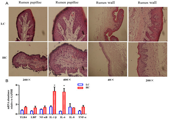 High-concentrate diet caused histopathological changes and inflammatory responses in the ruminal papilla and ruminal wall. (A) Representative sections of the ruminal papillae and wall from two groups. All sections were stained with H&E and observed at 40, 200 or 400× magnification. (B) mRNA expression of NF-κB signaling pathway-related genes in rumen epithelium. * indicates p < 0.05. HC, high-concentrate group. LC, low-concentrate group.