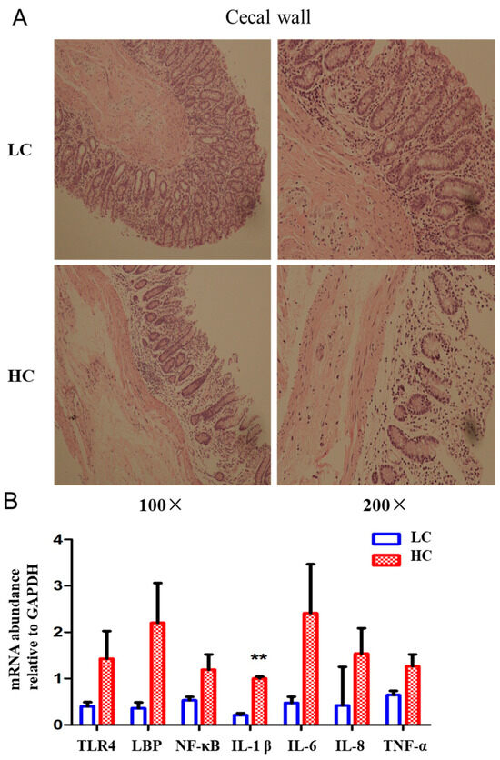 High-concentrate diet caused histopathological changes and inflammatory responses in the cecal wall. (A) Representative sections of the cecal wall from two groups. All sections were stained with H&E and observed at 100 or 200× magnification. (B) mRNA expression of NF-κB signaling pathway-related genes in cecal epthelium. ** indicates p < 0.01. HC, high-concentrate group. LC, low-concentrate group.