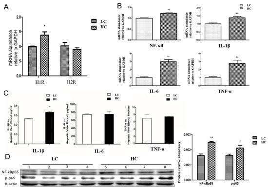 The physiological effects of histamine are mediated by histamine receptors, such as the H1 receptor and H2 receptor. High-concentrate diet feeding significantly increased the mRNA expression of H1R in the liver (Figure 5A). Another toxic metabolite, LPS, can bind to TLR4 to activate the NF-κB-regulated inflammatory signaling pathway. The level of pro-inflammatory cytokine IL-1β expressed in the hepatic vein was significantly increased by high-concentration feeding (Figure 5C). The mRNA expressions of NF-κB, IL-1β, IL-6, and TNF-α were markedly increased in the HC group compared with the LC group (Figure 5B). For the important inflammatory transcription factor, the protein abundance of NF-κB p65 and its activated state phosphorylated p65 were significantly increased by high-concentrate diet feeding (Figure 5D). These results showed that when histamine and LPS arrived at the liver, they induced an inflammatory response in the liver.