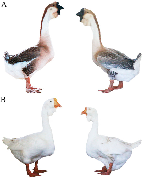 Phenotypic comparison between gray and white Shitou geese. (A) Male (left) and female (right) gray-feathered Shitou geese. (B) Male (left) and female (right) white-feathered Shitou geese.