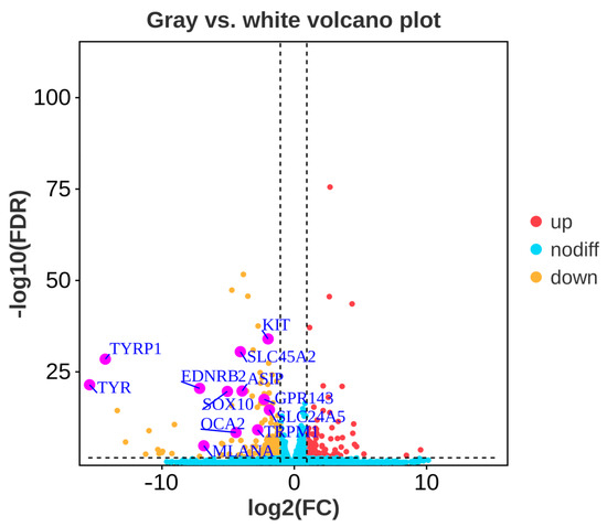 Volcano plot of differentially expressed genes between gray and white feather follicles in Shitou geese. Tyrosinase (TYR), Tyrosinase-related protein 1 (TYRP1), Endothelin receptor type B-like (EDNRB2), Melan-A (MLANA), SRY-box transcription factor 10 (SOX10), Solute Carrier Family 45 Member 2 (SLC45A2), G Protein-coupled Receptor 143 (GPR143), Transient Receptor Potential Cation Channel Subfamily M Member 1 (TRPM1), Oculocutaneous Albinism II (OCA2), Agouti Signaling Protein (ASIP), Kit Proto-Oncogene Receptor Tyrosine Kinase (KIT), Solute Carrier Family 24 Member 5 (SLC24A5).