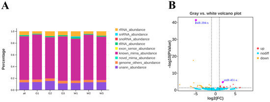 Analysis of differentially expressed miRNAs in gray and white feather follicles of Shitou geese. (A) The ratio of different types of small RNA in each sample; all: all samples; G1: Gray feather1; G2: Gray feather2; G3: Gray feather3; W1: White feather1; W2: White feather2; W3: White feather3. (B) Volcano map of differentially expressed miRNAs from gray and white feathers.
