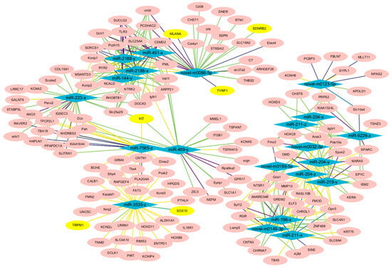 Construction of the miRNA-mRNA interaction network based on expression level correlations. The pink ellipses represent differentially expressed genes, the yellow ellipses represent pigment genes, and the blue diamonds represent differentially expressed miRNAs. The darker the color of the connecting lines, the greater the correlation coefficient.