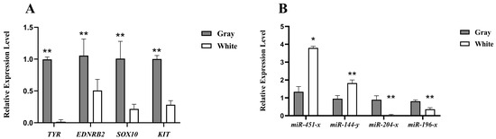 Verification of the sequencing results using qRT-PCR analysis. (A) Relative expression of Tyrosinase (TYR), Endothelin receptor type B-like (EDNRB2), SRY-box transcription factor 10 (SOX10) and Kit Proto-Oncogene Receptor Tyrosine Kinase (KIT) gene in gray and white feather follicles of Shitou geese. (B) Relative expression of miR-451-x, miR-144-y, miR-204-x, and miR-196-x in gray and white feather follicles of Shitou geese. * Indicates a significant difference (p < 0.05). ** Indicates an extremely significant difference (p < 0.01).