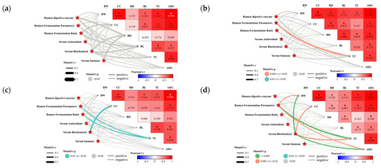 Correlation of rumen digestive enzyme activities, rumen fermentation parameters, rumen fermentation ratios, serum biochemical, immune, and antioxidant properties with lamb growth traits were evaluated and are presented in Figure 1. Overall, the body size indicators BW, CC, BH, BL, and TC of lambs showed a positive correlation with each other. Meanwhile, BW was significantly positively correlated with CC, BL, and TC. BW showed the strongest positive correlation with CC (Figure 1). The results of Mantel’s analysis of the treatment groups indicated that there was no significant correlation between any of the parameters and body size in the H group (Figure 1a). In the CAH group, only rumen fermentation parameters were significantly and positively correlated with TC (Figure 1b). In the CDH group, TC was significantly positively correlated with rumen fermentation parameters and rate, of which blood biochemistry was significantly positively correlated with CC (Figure 1c). Crossbreeding significantly influenced the correlation between serum biochemistry, rumen fermentation parameters, and lamb body size indices (Figure 1d).