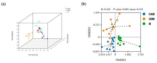 Beta diversity Composition comparison of rumen microbiota in the H, CAH, and CDH groups. (a) Principal coordinate analysis (PCoA), The coordinates indicate the selected primary coordinate component and the percentages indicate the contribution of the primary coordinate component to the difference in sample composition; (b) Non–MetricMulti–Dimensional Scaling (NMDS); stress less than 0.2 indicates that the NMDS analysis has some reliability. In this case, the closer the R–value is to 1, the greater is the between–group difference compared to the within–group difference, while p value less than 0.05 indicates that the between–group difference is significant. The closer the samples are on the coordinate graph, the higher is the similarity.