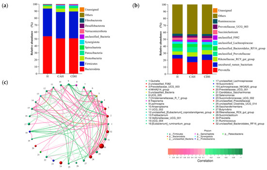 Stacked histograms of the relative abundance of the rumen microbiota of the H, CAH, and CDH groups at the phylum (a) and genus (b) levels of the Top 10, and correlation network plots for genus level abundances above 0.50% (c). The horizontal coordinate is the name of the grouping, the vertical coordinate is the proportion of the species in that sample, different colored bars represent different species, and the length of the bar represents the size of the proportion of that species. The color of the dots in the network diagram represents the phylum to which they belong, and the size indicates the abundance. Meanwhile, the color of the concatenated line indicates positive (red) or negative (green) correlation, and the thickness indicates the correlation size.